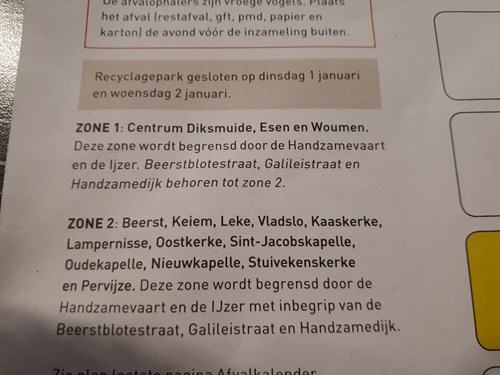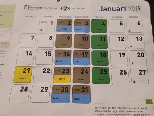 Bijvoorbeeld: op woensdag halen ze restafval op in zone 1 ( = verschillende straten in de gemeente)